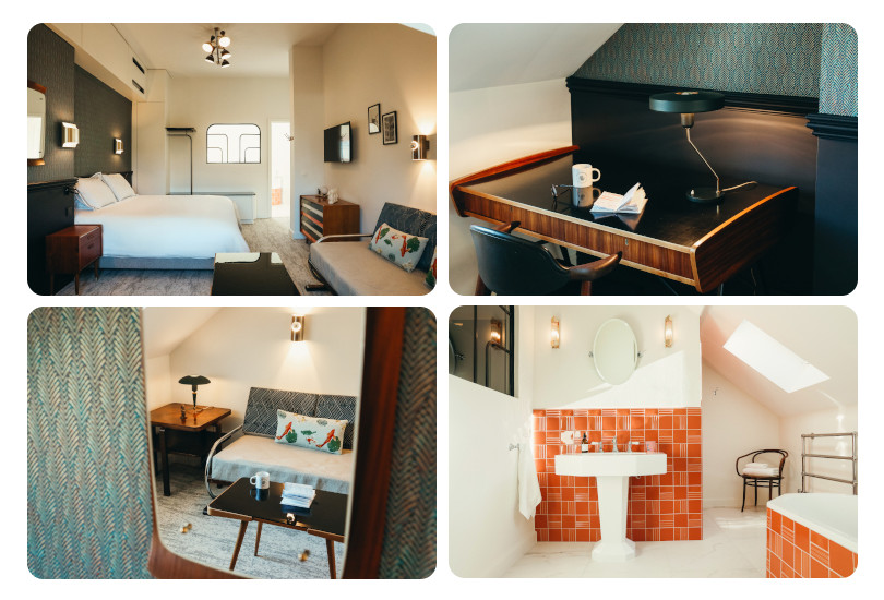 The suite Jeanne is particularly spacious and features a sitting area, a desk, a private bathroom (bath and shower), and a separate toilet. It is equipped with a king-size bed (180 cm), wardrobes, free Wi-Fi, air conditioning, a smart TV, a mini-fridge, a Nespresso machine and kettle, Makesenz toiletries, and a hairdryer. It is accessible by elevator (floor +2). An à la carte breakfast is included.